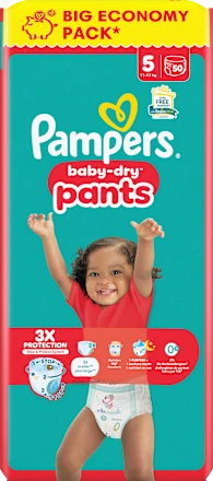 Die Baby Pants Baby Dry in der Größe 5 Junior im Big Pack von Pampers sind ideal für Kinder von 11 bis 17 Kilo. Dank des dreifachen Schutzes wird der kleine Schatz mit dem Stop & Schutz Täschchen, dem 360° dehnbaren Bauchbündchen und der doppelten Beinbündchen rundum versorgt. Zudem wird das An- und Ausziehen zum Kinderspiel – auch wenn die Bewegung genau in diesem Alter besonders spannend ist.