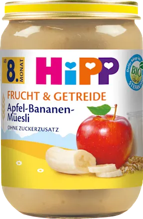 Das Apfel-Bananen Müesli von HiPP enthält spezielle Obstsorten, die genügend Zeit zum Reifen hatten und so ganz natürlich ihren vollen Fruchtgeschmack entwickeln konnten. Mit feinen Haferflocken - zum Kauen lernen. Und ganz ohne Zusatz von weiterem Zucker (Zutaten enthalten von Natur aus Zucker).
