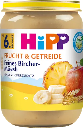 Für noch mehr Abwechslung auf Babys Speiseplan: Milde Früchte und feines Getreide machen das Hipp Frucht & Getreide Feines Bircher Müesli gut sättigend. Sie enthalten nur natürliche Süße aus Früchten und sind ohne Zuckerzusatz hergestellt. Ab 6. Monat.