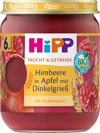 Das Frucht & Getreide Direktpüree Himbeere in Apfel mit Dinkelgrieß von HiPP eignet sich für Babys ab dem sechsten Monat. Erntefrische Bio-Früchte werden tiefgekühlt und im Nachhinein schonend püriert. Diese geschmacksschonende Verarbeitung sorgt für einen besonders fruchtigen Fruchtgeschmack. Darüber hinaus werden der Bio-Rezeptur kein Zucker zugesetzt (enthält von Natur aus Zucker).