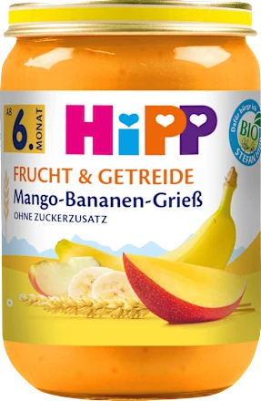 Das HiPP Gläschen Mango-Bananen-Grieß besteht aus speziellen Obstsorten, die genügend Zeit zum Reifen hatten und so ganz natürlich ihren vollen Fruchtgeschmack entwickeln konnten. Natürlich in 100% HiPP Bio Qualität und ohne Zuckerzusatz (Zutaten enthalten von Natur aus Zucker) und süßende Fruchtsaftkonzentrate.