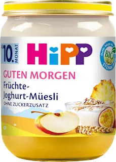 Babys erstes Müesli mit auserlesenen, milden Früchten, feinkörnigem Vollkorngetreide und cremigem Joghurt: Hipp Guten Morgen Früchte-Joghurt-Müesli enthält viel Calcium für stabile Knochen und Zähne. Ab 10. Monat.