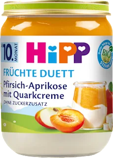 Für das Früchte-Duett Pfirsich-Apikose mit Quark-Creme von HiPP werden spezielle Obstsorten ausgewählt, die genügend Zeit zum Reifen hatten und so ganz natürlich ihren vollen Fruchtgeschmack entwickeln konnten. Kombiniert mit babygerechtem Joghurt mit Calcium, natürlich in 100% HiPP Bio Qualität und ohne Zuckerzusatz (Zutaten enthalten von Natur aus Zucker) und süßende Fruchtsaftkonzentrate.