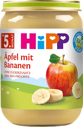 Mit dem HiPP Früchte Äpfel mit Bananen Gläschen geben Sie Ihrem Baby ab dem 5. Monat 100% Bio Fruchtpüree. Die HiPP Gläschen bieten sich ideal als Nachspeise oder Brei-Zusatz an. Dank der streng kontrollierten Auswahl an Früchten stellt HiPP sicher, dass die vorhandenen Obstsorten genügend Zeit zum Reifen hatten und Ihr Baby somit in den Genuss des vollen Fruchtgeschmacks kommt.