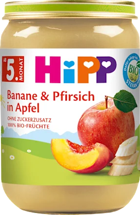 Mit dem HiPP Früchte Banane und Pfirsich in Apfel Gläschen geben Sie Ihrem Baby ab dem 5. Monat 100% Bio Fruchtpüree. Die HiPP Gläschen bieten sich ideal als Nachspeise oder Brei-Zusatz an. Dank der streng kontrollierten Auswahl an Früchten stellt HiPP sicher, dass die vorhandenen Obstsorgen genügend Zeit zum Reifen hatten und Ihr Baby somit in den Genuss des vollen Fruchtgeschmacks kommt.