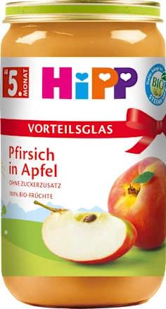 Für Hipp Pfirsich in Apfel werden besonders streng kontrollierte Früchte ausgewählt, die schonend zubereitet werden – ohne Zuckerzusatz (Zutaten enthalten von Natur aus Zucker) sowie ohne Zusatz von Milchprodukten. Nach dem 4. Monat.