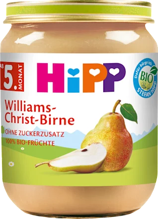 Für Hipp Bio-Birne werden besonders streng kontrollierte Früchte ausgewählt, die schonend zubereitet werden – ohne Zuckerzusatz (Zutaten enthalten von Natur aus Zucker) sowie ohne Zusatz von Milchprodukten. Nach dem 4. Monat.