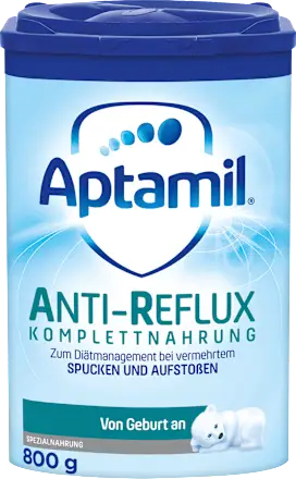 Nach dem Füttern stoßen Säuglinge oft kleine Mengen Milch wieder auf. Jedoch gibt es Säuglinge die deutlich mehr als üblich Nahrung spucken und aufstoßen. Basierend auf unserer Forschung haben wir unsere bewährte Aptamil® Anti-Reflux Spezialnahrung weiter entwickelt: Die Aptamil® Anti-Reflux Komplettnahrung ist speziell für Babys geeignet, die deutlich mehr als üblich Nahrung spucken und aufstoßen. Der natürliche Quellstoff Johannisbrotkernmehl macht die Nahrung besonders sämig. Dadurch bleibt die Nahrung besser im Magen und vermindert so den Rückfluss in die Speiseröhre (Reflux).