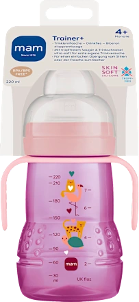 Der MAM Trinklernflasche Trainer+ 220 ml ab 4 Monaten in rosa, Motiv Schildkröte unterstützt beim einfachen Übergang vom Stillen oder der Flasche zum Trinkbecher. Das praktische MAM Trainer+ Set enthält dafür einen tropffreien MAM Sauger, den MAM Trinkschnabel ultra-soft und einen MAM Hold My Bottle Flaschengriff. So kann Ihr Baby Schritt-für-Schritt das selbstständige Trinken lernen. 1. Schritt: Der tropffreie MAM Sauger erleichtert den Übergang vom Stillen zur Flasche oder zum Trainer+. Dank der Schlitzöffnung ist er tropffrei und das Baby kann den Trinkfluss selbst steuern. 2. Schritt: Mit dem tropffreien, extra weichen Trinkschnabel gelingt der Übergang vom Stillen oder der Flasche zum Becher besonders leicht. Der Trinkschnabel hat kein Ventil, und ist Dank der Schlitzöffnung tropffrei. Der Trick: Die symmetrischen Sauger und Trinkschnäbel von MAM simulieren mit ihrer naturnahen SkinSoft Oberfläche Mamas Brust beim Trinken und die flache Form und das besonders weiche Silikon fühlen sich vertraut an.