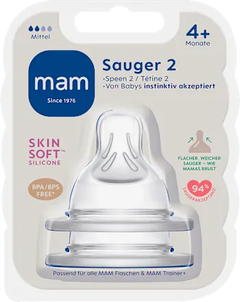 MAM Sauger sind aus speziellem MAM SkinSoft Silikon - kein anderes fühlt sich weicher an. Die spezielle Form der MAM Sauger sowie Strukturstreifen im Inneren des Saugers, die ein Zusammenfallen während des Trinkens verhindern, sorgen für ein angenehmes Trinkgefühl. MAM Sauger passen auf alle MAM Weithalsflaschen sowie den MAM Trainer. Der MAM Sauger Gr. 2 ist für Babys ab 4 Monate geeignet. Durchflussrate Gr. 2: mittel. Der MAM Sauger Gr. 2 entspricht der Norm EN 14350 und ist selbstverständlich BPA-frei.