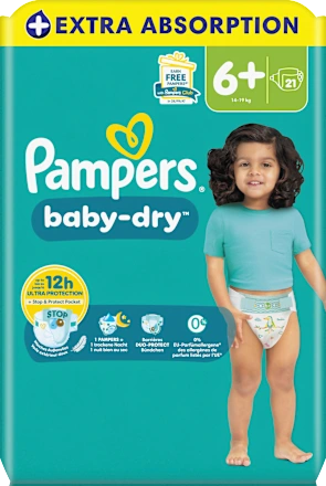 Die Baby Dry Windeln Größe 6+ XL von Pampers sind für Kinder zwischen 14 und 19 Kilo. Mit ihrer extra Saugfähigkeit und dem Stop & Schutz Täschchen wird ein wunderbarer Auslaufschutz für die ganze Nacht garantiert. Zudem befindet sich eine besondere Trockenheitseinlage für eine schnelle Absorption im Inneren. Außerdem passen sich die Flexi-Seitenflügen an den Körper des kleinen Schatzes an und sorgen so für eine sichere Passform.