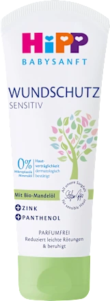 Die parfumfreie Wundschutzcreme von HiPP Babysanft mit Bio-Mandelöl, Zink, Panthenol und natürlichem Wollwachs reduziert leichte Rötungen und beruhigt irritierte Haut - ab dem 1. Lebenstag. Sie bildet einen Schutzfilm im Windelbereich und beugt so Wundsein vor. Bei jedem Windelwechsel kann sie dünn aufgetragen werden.